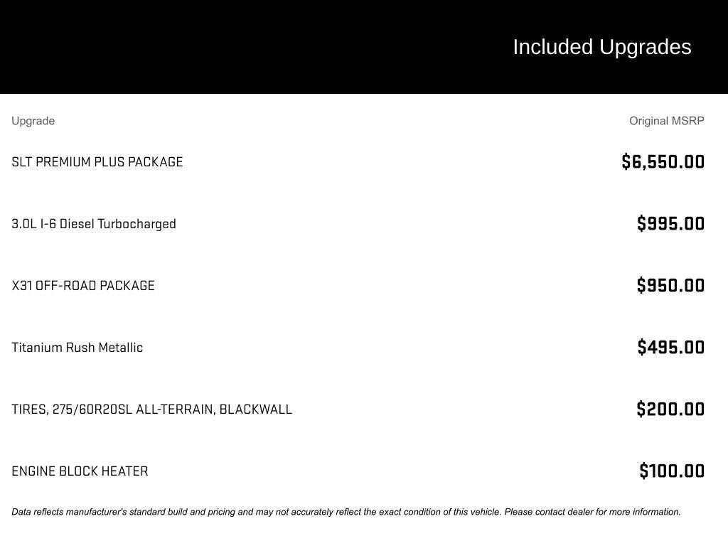 This Sierra features the SLT Premium Plus Package, X31 Off-Road Package, Sierra Safety Plus Package, SLT Convenience Package, SLT Preferred Package, and Trailering Package, making it an outstanding combination of comfort, technology, efficiency, and towing performance.